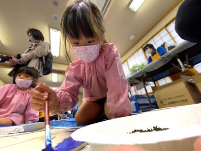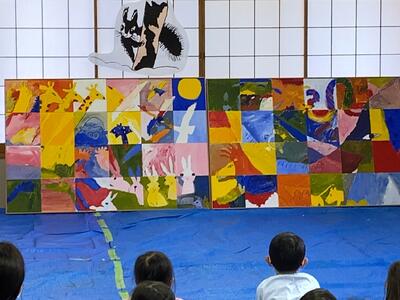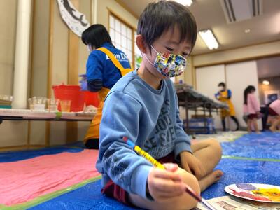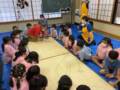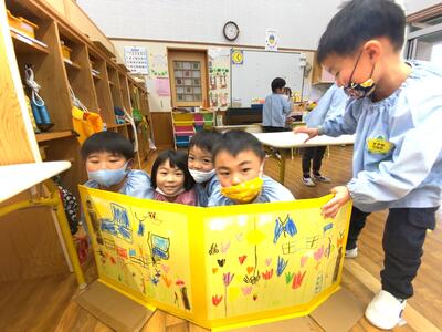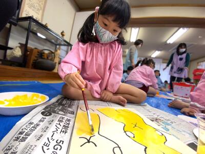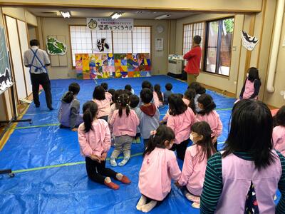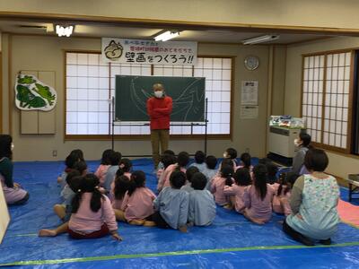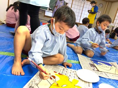 年長児が、絵本作家の先生といっしょに一枚の壁画を描きました。絵本作家の先生がたたみ4枚分ほどの大きさの下絵を描き、それを48枚に分けたものに、絵の具で自由に色を塗りました。テーマは動物です。後日、磐梯町のリアンドールに飾られる予定です。