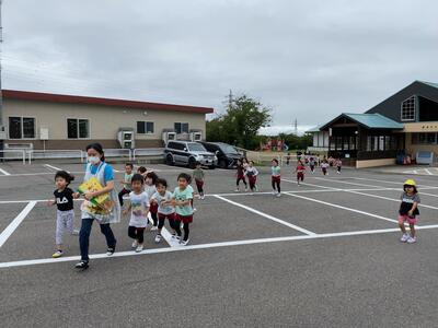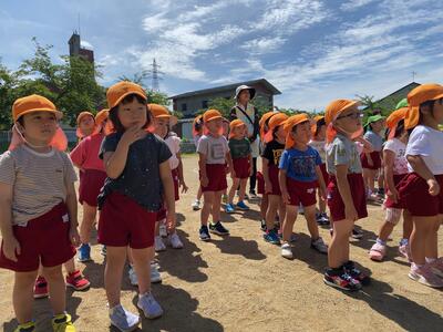 その後、駐車場に避難しました。年少さんは少し泣いてしまいましたが、年中さんと年長さんは泣かずに素早く避難できました。とても立派でした。