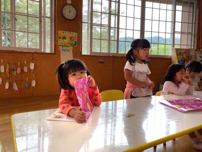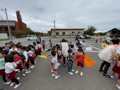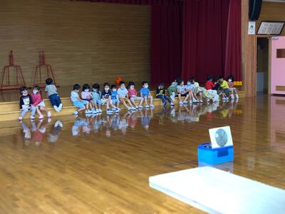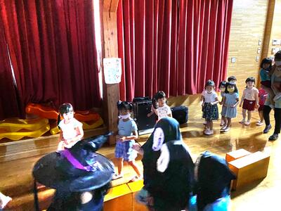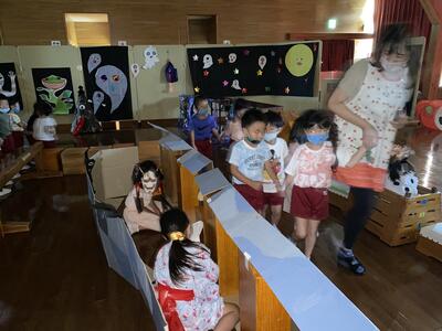 年長さんがおうちの方と一緒に作ったお化けで年少さん、年中さんを楽しでもらうという嗜好です。それぞれの学年が、楽しんだり、楽しませたり、充実した催しをなりました。