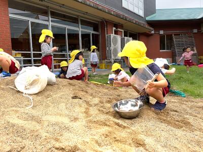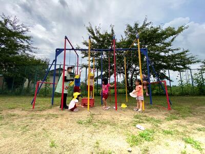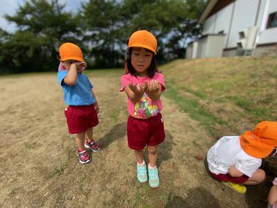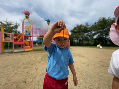 今日は、年少さんと年中さんは、午前中の比較的涼しいうちに、園庭で好きな遊びをしました。水分を補給しながら、安全に配慮しながら遊びました。