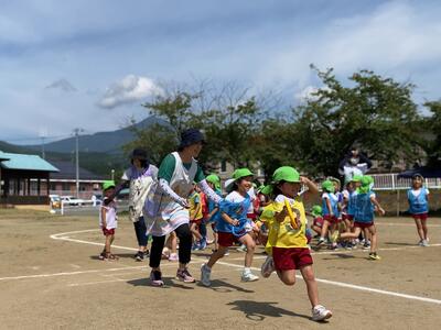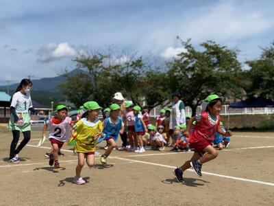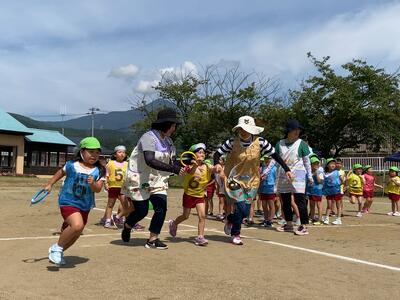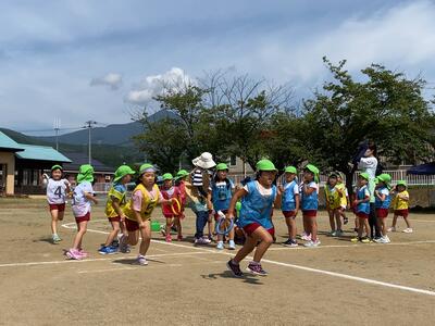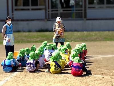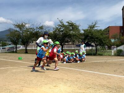 昨日、年長さんが運動会に向けて、リレーの練習を行いました。バトンの渡し方を確認して、みんな一生懸命走りました