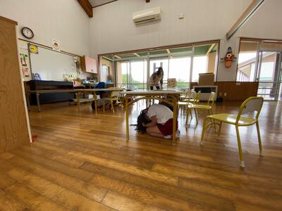 子どもたちは、地震発生の放送後すぐにダンゴムシのポーズでテーブルの下に入りました。テーブルがそばになかった年長さんは、頭を抱えたポーズをとりました。