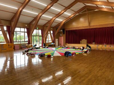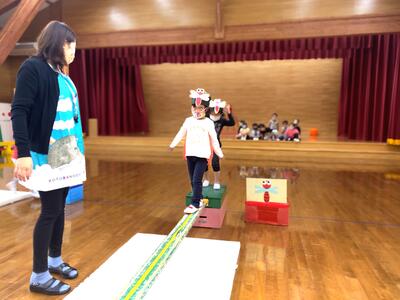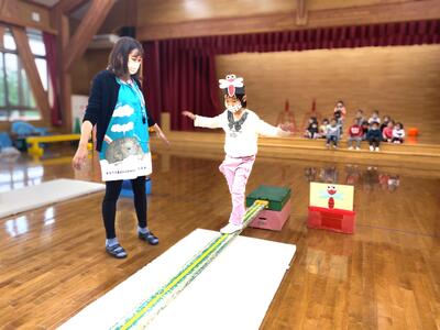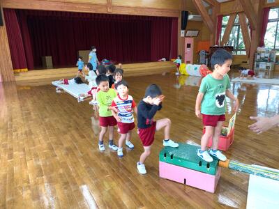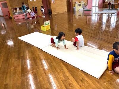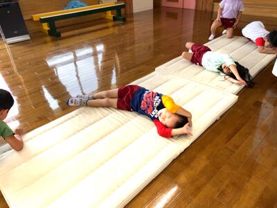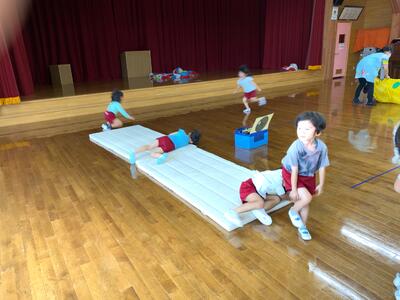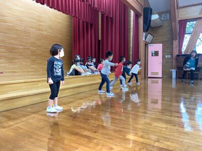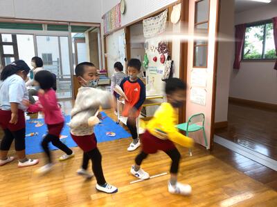 年中さんは、遊戯室で運動会の練習をしました。みんな楽しそうに、一生懸命取り組んでいました。