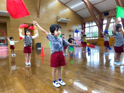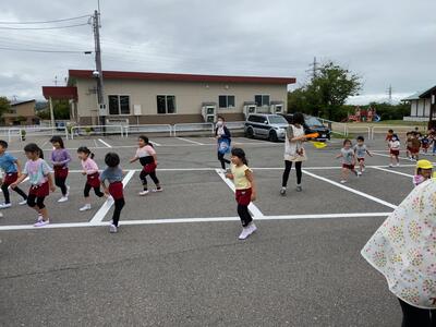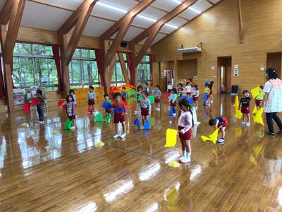 年中さんは、遊戯室で運動会の練習です。上手になってきました。