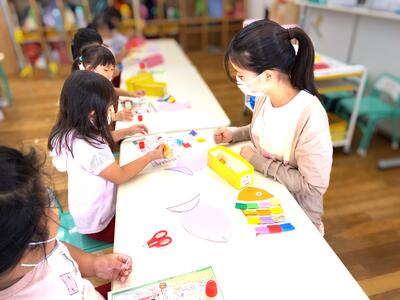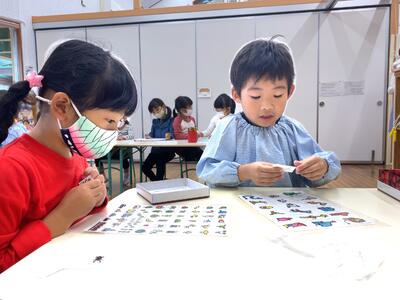 年長さんは、教育実習の先生に教えてもらって、カラフルうろこのさかなを作りました。
