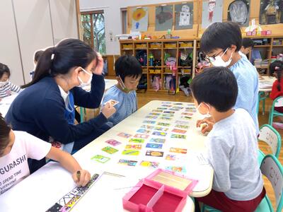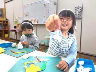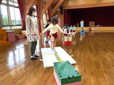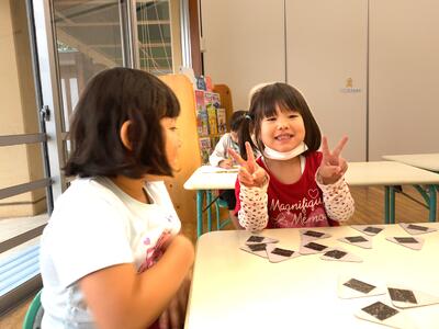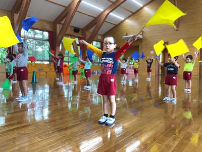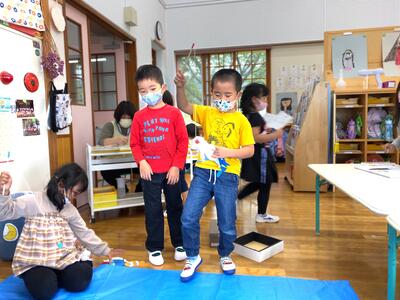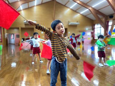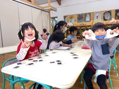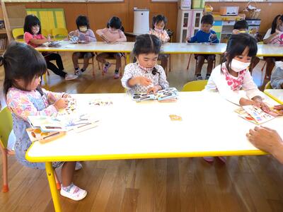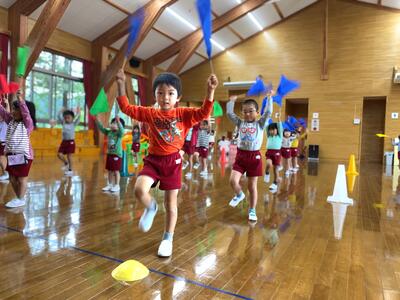 年中さんは昨日に続いて運動会の練習の様子を、年長さんは魚釣りから紙飛行機遊びへとあそびが変化していったところ、また、カルタや粘土遊びの様子をお伝えします。年長さんの様子は明日、お伝えします。