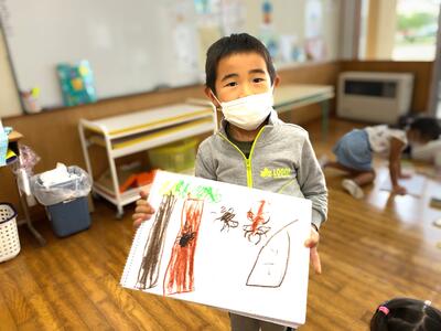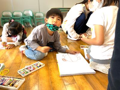 年長さんは、運動会の練習の後、昨日の続きで魚釣りごっこを楽しんだり、絵を描いていました。