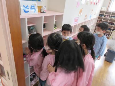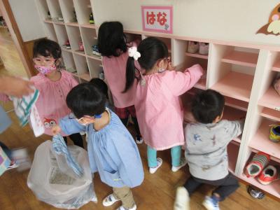 また、年長児も、それぞれに年中児も年少児も自分の下駄箱をきれいに拭いて掃除しました。