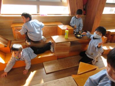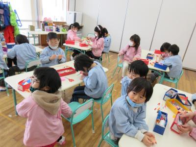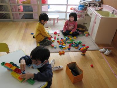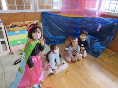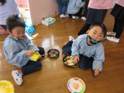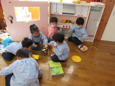 巧技台で遊んだり、積み木で隠れ家を作ったり、ジュース屋さんやカップケーキ屋さん、お化粧ごっこやコックさんなどたくさんの遊びが見られました。