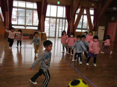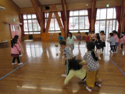 お遊戯室で、クラス対抗のドッヂボールをしました。