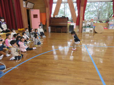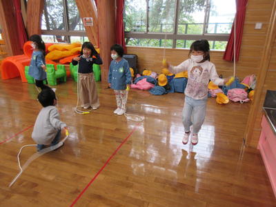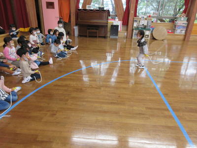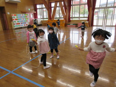 2020年10月14日 16時12分年中児は、運動あそび発表会にもらった縄跳びで跳ぶ練習をしています。