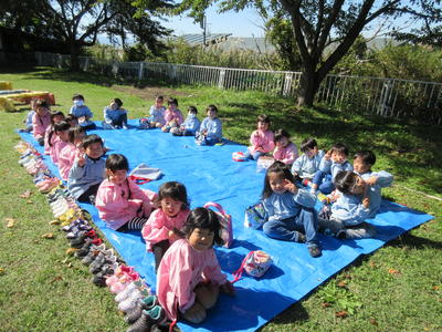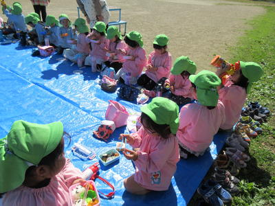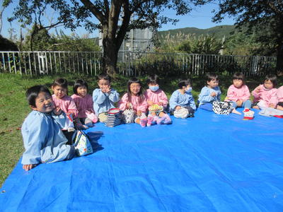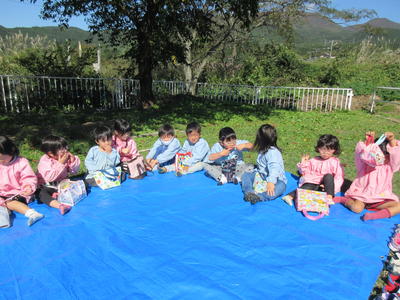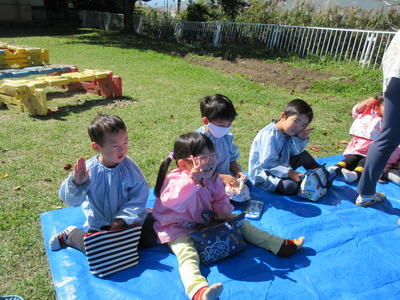 お天気が良かったので、年少児のお部屋の庭でみんなで食べました。