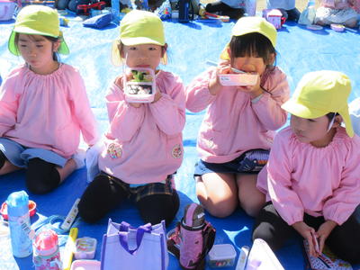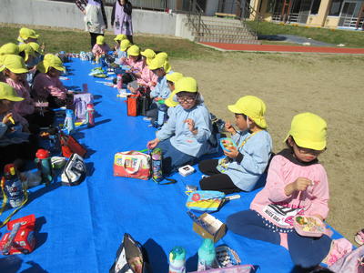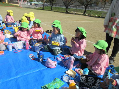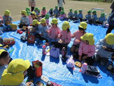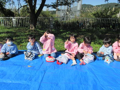 2020年10月16日 14時41分年中児と年長児は、園庭で一緒に食べました。