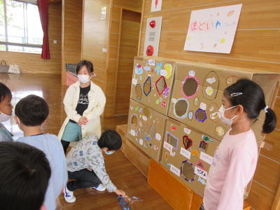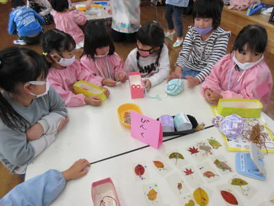 「あきとあそぼう」という活動で、小学生が工夫して作ってきた、迷路や魚釣り、的あて、マラカス、どんぐりゴマなどの作り方を教えてもらったり、遊んだりしました。