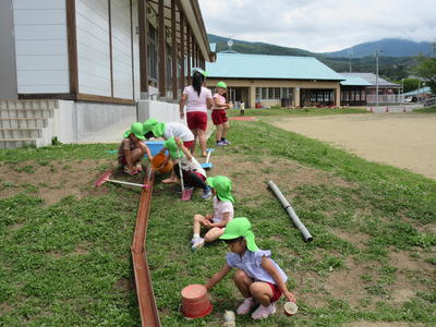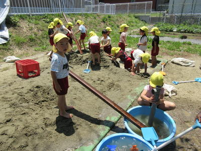 年長児は、砂場でダイナミックに砂と水で遊びました。