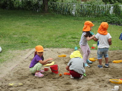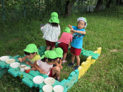 遊戯室の脇の園庭で水と砂での遊びを満喫しています。