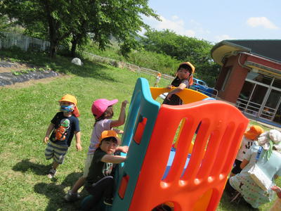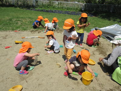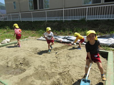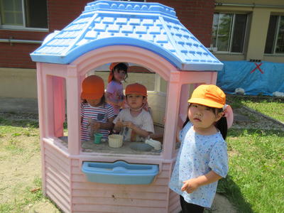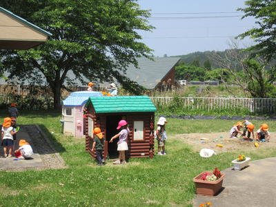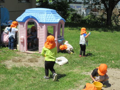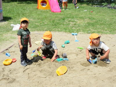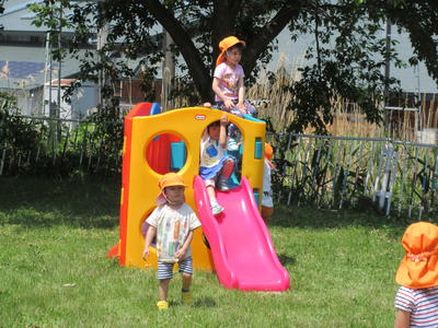 年少児は、お部屋の裏の園庭で、砂場や遊具で楽しく遊びました。