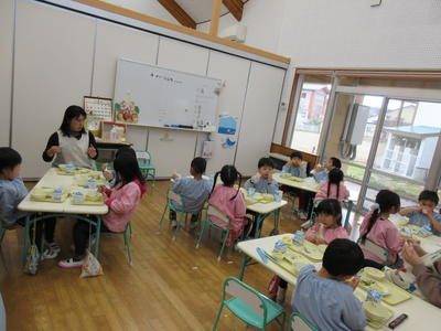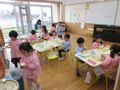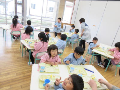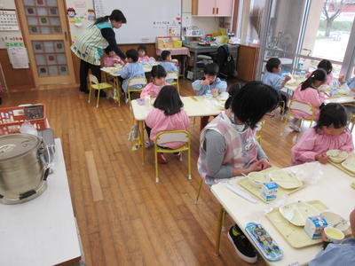 年中児と年長児は、久しぶりの給食をおいしそうに食べました。