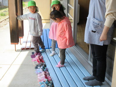 コロナウイルス対策として密集を避けるために、年中児と年長児の出入り口をベランダ側にしています。