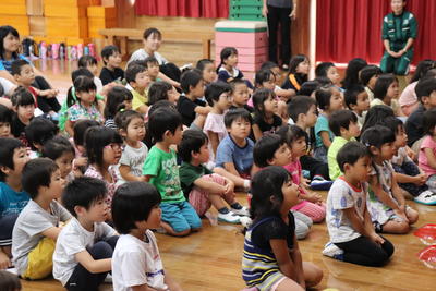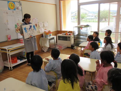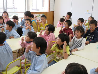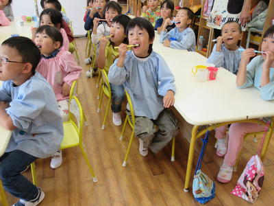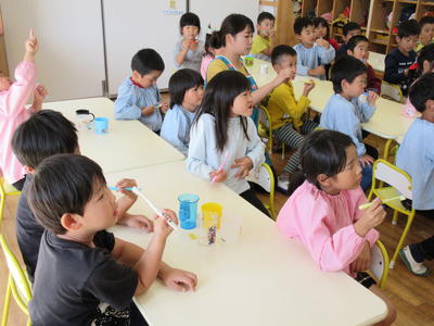 給食時間の終わりに保健師さんに来ていただき、年長児は、上手な歯みがきの仕方を教えてもらいました。