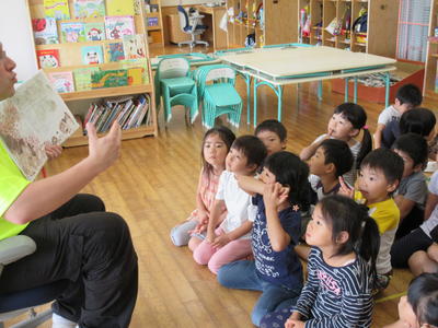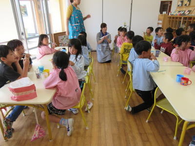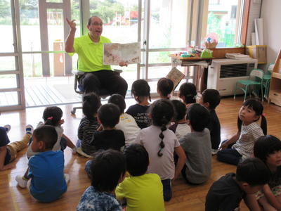 年中児は、朝のうちにダン先生に英語の絵本の読み聞かせをしてもらってから、缶ぽっくりの練習をしました。