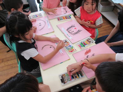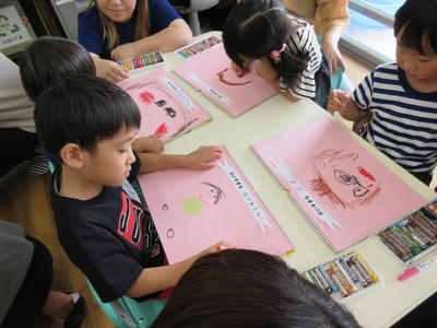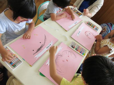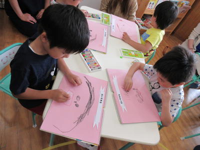 年中児は、お家の方の顔をよく見ながらクレヨンと絵具をつかい描いていました。