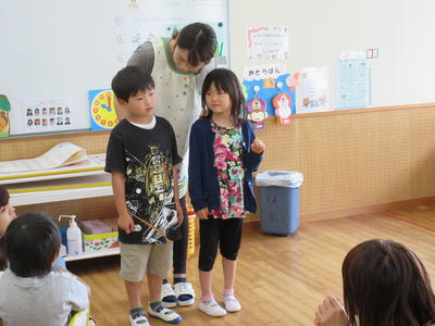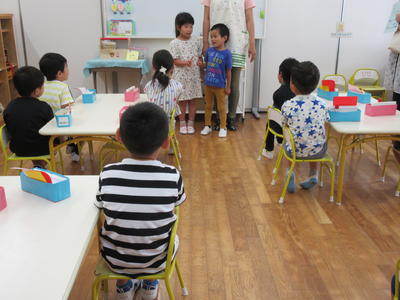 年長児は、朝の会でお当番さんが出席の確認をしました。