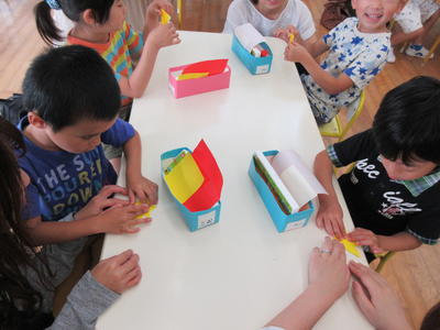年少児は、ハサミでの1回切りや糊付けを経験しながら、おり姫とひこ星の制作をしました。