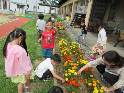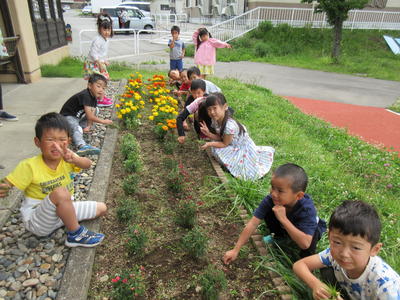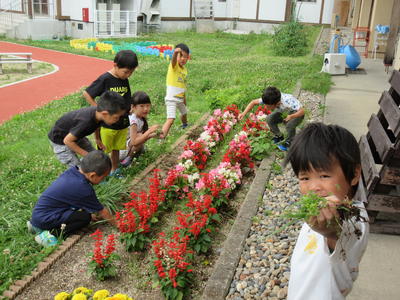 登園するとすぐに、年長児は玄関前の花壇の草むしりをしました。