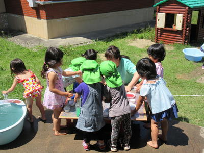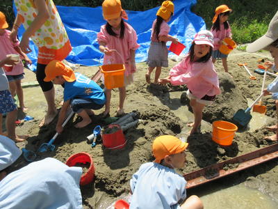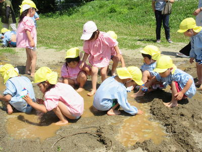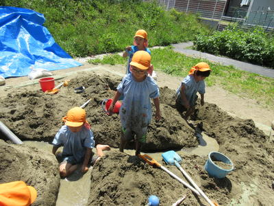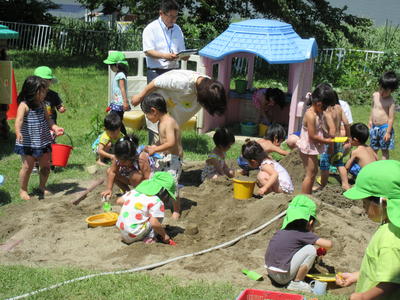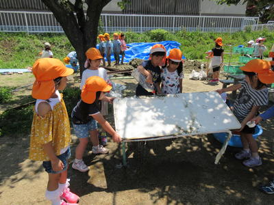 年中児も砂遊びで水を流して、自分で作った船を浮かべて遊びました。