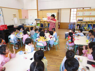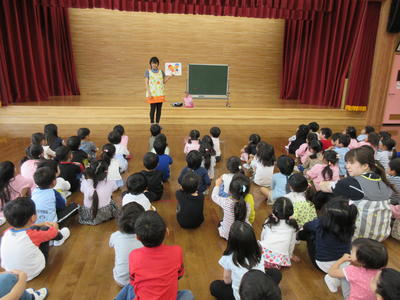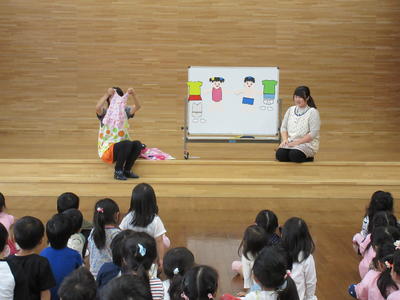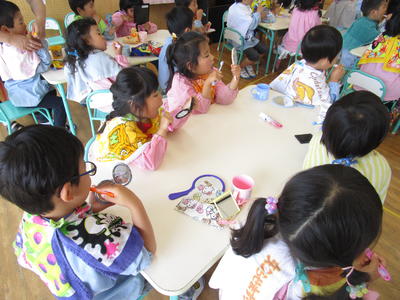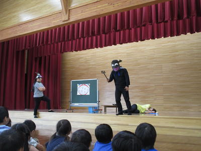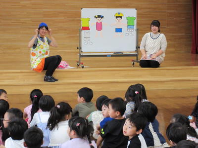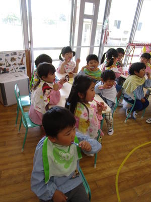 最初に、歯みがきの大切さの寸劇をみてから、保健師さんに指導を受けながら正しい歯の磨き方を学びました。