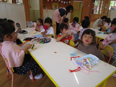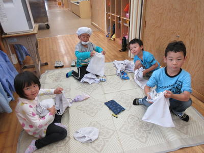 年長児は、給食用エプロンのたたみ方も上手になってきました。