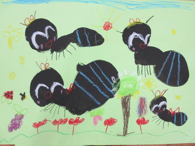 年中児のありの絵が完成しました。女王ありや遊んでいるあり、お菓子を食べているありなど、いろいろ楽しく描きました。