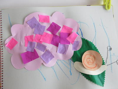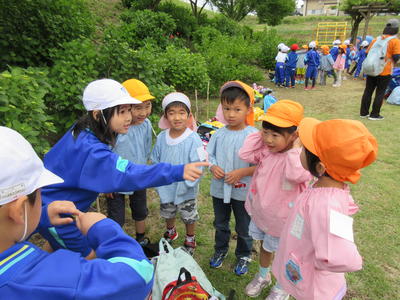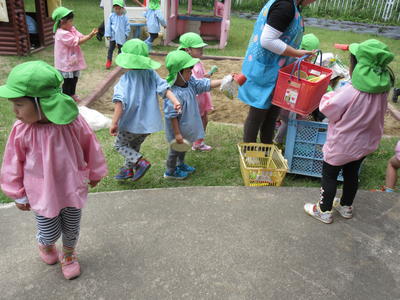 年少児は、はじめてハサミを使ってアジサイの花を切ったり、雨を降らせたりしました。