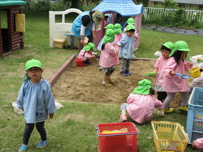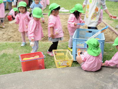 気温も上がり日も差してきたので、砂場遊びをしました。