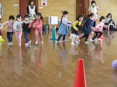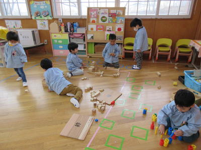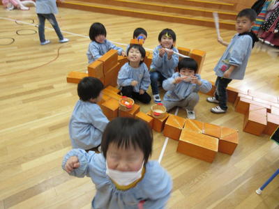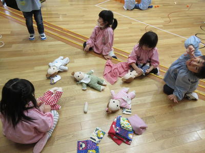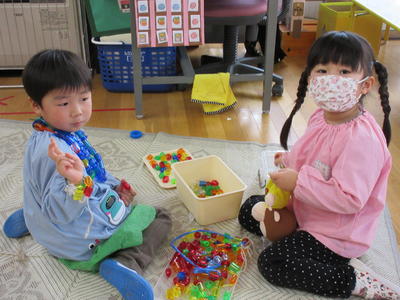 あいにくの雨の1日。年少児は、お部屋やホールでそれぞれの遊びを楽しみました。