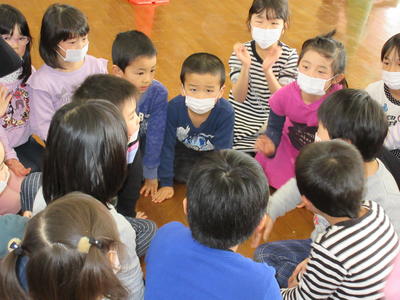 年長児の得意の遊びの一つ。人間知恵の輪です。みんなで手をつなぎ、その手をくぐったり交差させたりして知恵の輪をつくります。それを、4人の当番さんがほどいていくという遊びです。