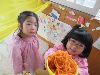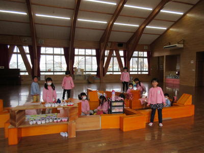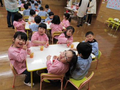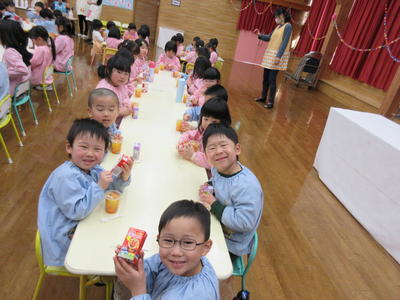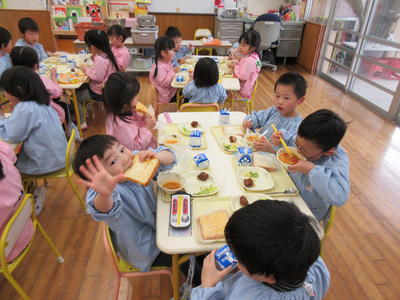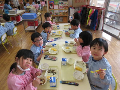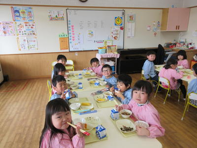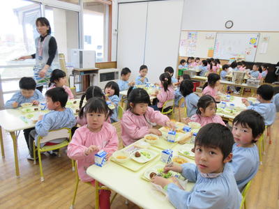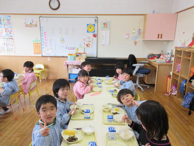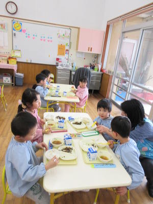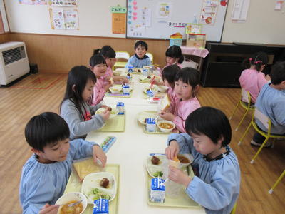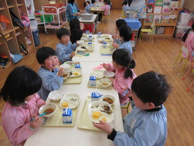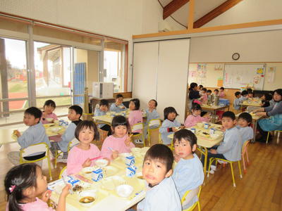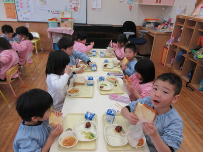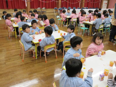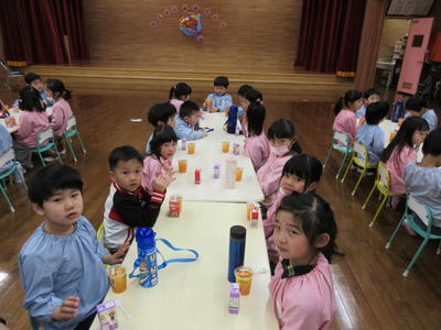 インフルエンザも治まってきたので、今日から年中児の給食に年少児が混ざって食べ始めました。