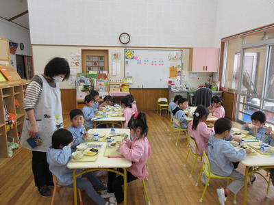 年中児のクラスの給食に年少児が入っての給食も今日が最終となりました。