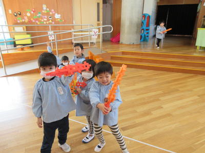 年中児は、お店屋さんごっこで作った「スーパーロケット」をピカチュウの的に当てて、投げる練習をしています。