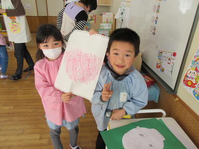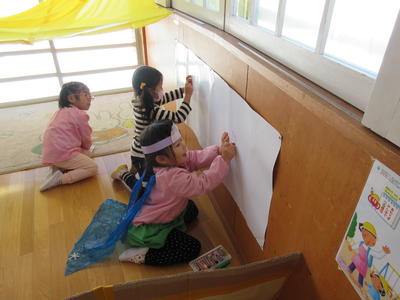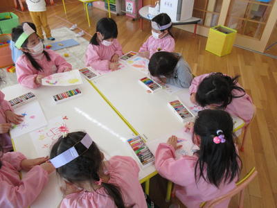 年長児は、卒園前の表現遊びとして、紙はんがの下絵づくりをしました。