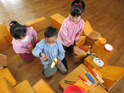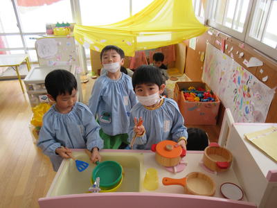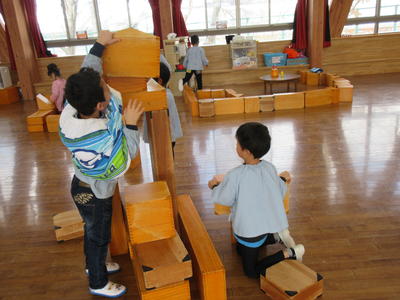 年中児は、午前中は、遊戯室でままごとや積木でマシーンづくり、かくれんぼをしていました。