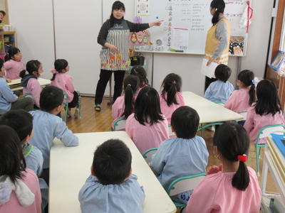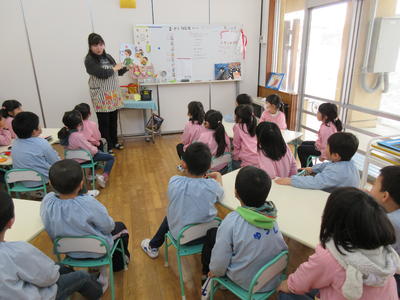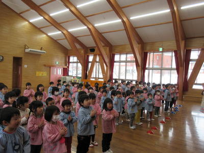 幼稚園では、毎週月曜日に遊戯室に全園児が集まって、小学校の朝の会のような集会を行っています。