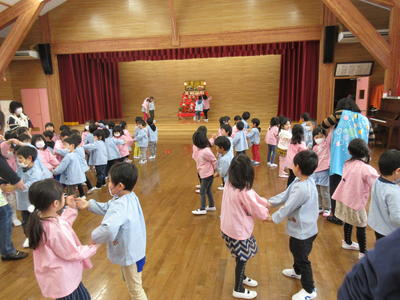 最後にみんなで「ダンスダンスひな祭り」を踊りました。年長児の代表がステージの上で踊りのお手本を見せてくれました。