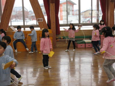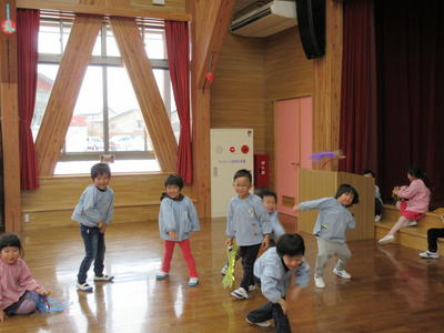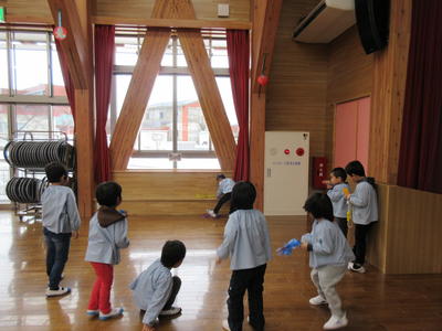 子どもたちは、登園すると、遊戯室に行って冬期間の運動に取り組んでいます。