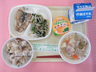 今日の給食の献立は、五目ごはん、牛乳、豚汁、サンマのかば焼き、ほうれんそうのお浸し、かぼちゃプリンでした。