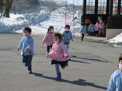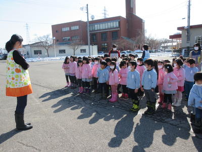 今回は、年中児と年長児には予告なしで行いました。万が一の時に自分の命を守ることができるように突然の訓練をしました。