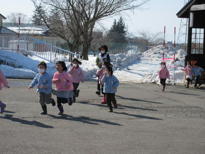 今朝は、豆まきの鬼が、とうとう昨日いたそら組からにじ組まで歩いて?来ました。