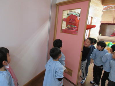 今日、お遊戯室の入り口のドアを見たら、なんとドアの窓から鬼がのぞいていました。
