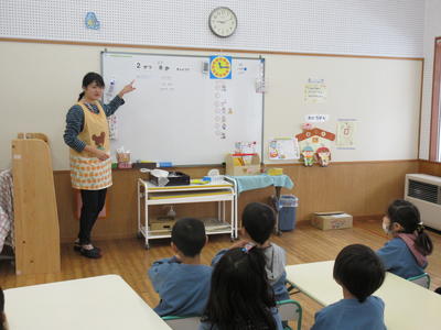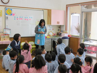 桃太郎に来てもらうといいということになり、今日は「桃太郎」の絵本の読み聞かせになりました。